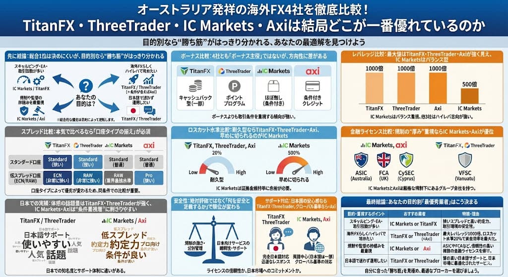 オーストラリア発祥の海外FX業者として、よく比較対象になるのが TitanFX/ThreeTrader/IC Markets/Axi の4社です。